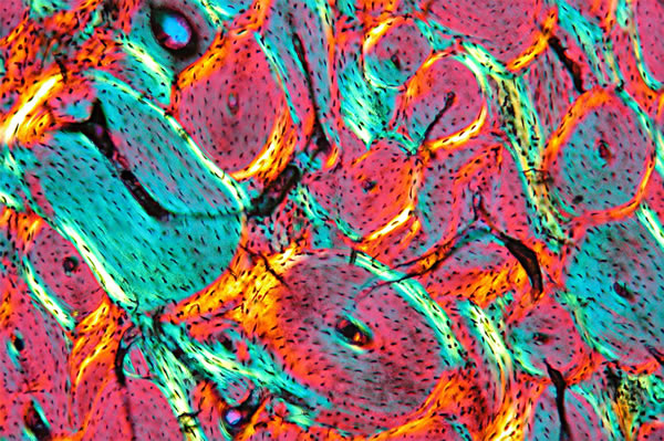 来自落基山脉博物馆加布里尔细胞与分子古生物学实验室(Gabriel Lab for Cellular and Molecular Paleontology at the Museum of the Rockies)的Ellen-Thérèse Lamm和蒙大拿州立大学的Jack Horner教授共同利用蒙大拿州立大学的显微镜拍摄了一张恐龙化石切片照片,这张照片入围了国际显微摄影大赛的决赛,并吸引了众多粉丝。Lamm和Horner曾在今年四月份发表了一篇研究不同阶段三角龙(Triceratops)褶边微观结构的文章,当时为了使研究更为直观,Lamm制作了这块薄片以获取显微照片。
