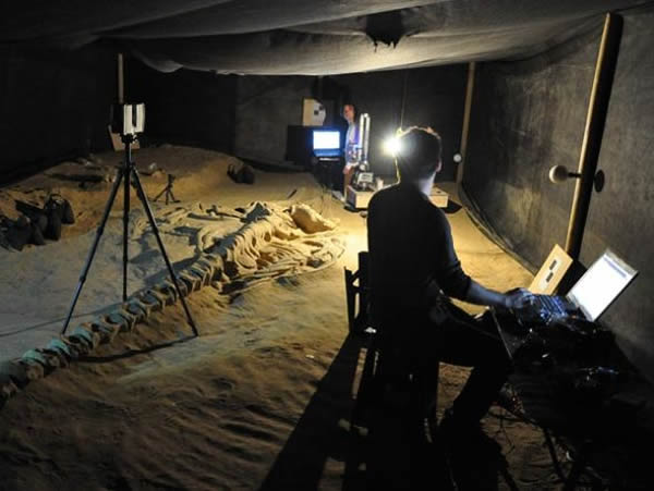 在阿塔卡马沙漠中临时搭建的工作室中,美国史密森学会的研究人员正在扫描一具鲸类骨架化石以制作三维数字模型,以备回到美国国家自然历史博物馆后继续研究。皮恩森介绍说,“我们在标本周围搭建了帐篷,因为我们希望利用高分辨率激光扫描仪进行扫描,并切断沙尘、风暴以及日晒等因素的干扰,尽可能地建起最稳定的研究环境。”