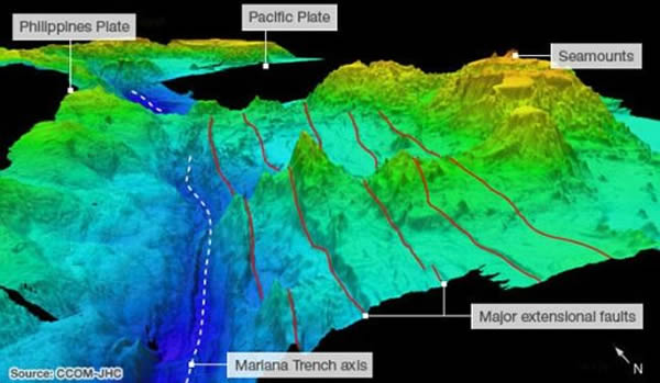 马里亚纳海沟是太平洋板块和亚欧板块相互交汇的地方,太平洋板块在这里向下俯冲到菲律宾板块下方。本次研究工作将帮助科学家们搞清海底的山峰在板块向下俯冲时将呈现何种状态。加德纳说:“我们的数据显示这些山地会破碎。当太平洋板块开始弯曲向下俯冲时,那些较为年老的板块区域就会开始破碎。它们分裂成许多较小的碎片并被挤入地层深处。”