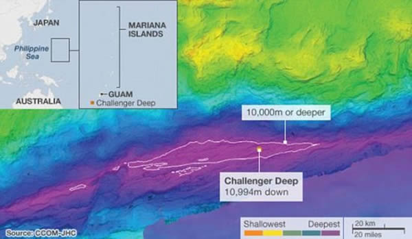 海军调查船和美国新罕布什尔大学海岸和海洋制图中心(CCOM)的科学家们通力合作,成功获取了覆盖整个马里亚纳海沟,分辨率达到100米的海底地形图,其中包括地球上最深的地方——挑战者海渊(Challenger Deep)。