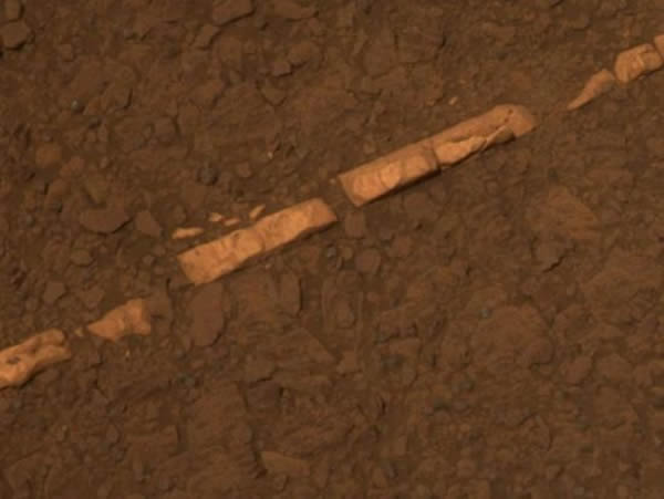 这是一张被“机遇”号火星车拍摄的石膏矿脉照片