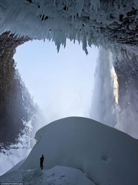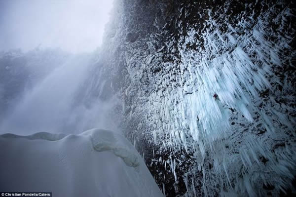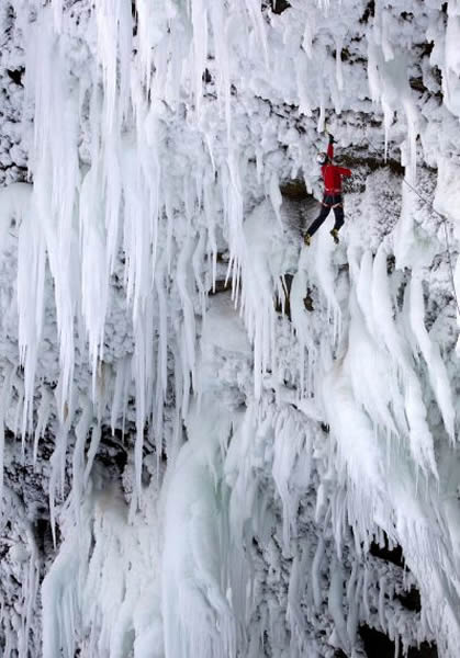 加拿大和英国攀登高手威尔-加德和蒂姆-埃米特冒着生命危险征服加拿大的汉默肯瀑布。汉默肯瀑布高450英尺(约合137米),悬挂着无数垂冰,号称世界上难度最大的攀登之地,同时也是很多攀登高手决心要征服的目标。