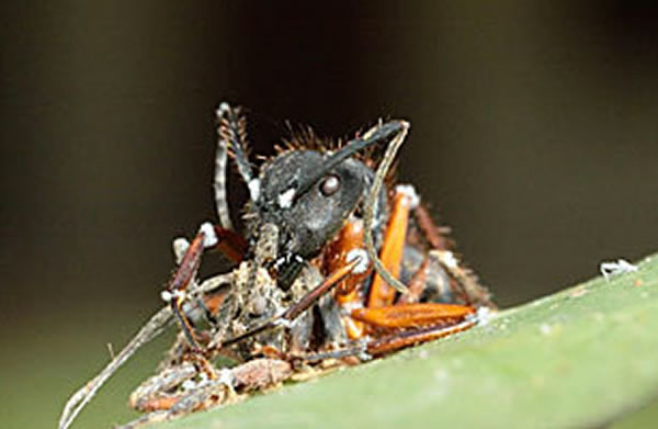 在对巴西木匠蚁进行研究时,科学家发现这种可怜的蚂蚁被4种不同的真菌感染,最后将它们变成僵尸。进入蚂蚁体内之后,这些真菌操控蚂蚁的行为,迫使它们四处游荡,直到来到适于它们传播孢子的地方。随后,这些真菌杀死宿主,将尸体变成培养基。