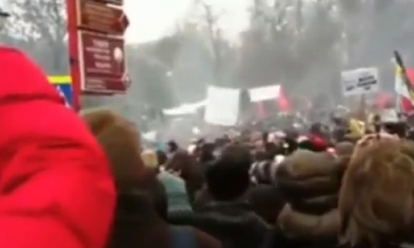 惊奇不已的抗议者争相用相机或手机将这一幕拍摄下来,甚至有抗议者爬上大树,试图近距离观察这个神秘飞行物。而这架UFO似乎也正在默默地观察下面的2.5万名抗议者,