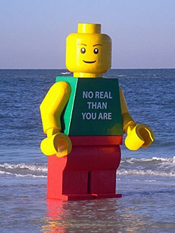 10月,一个8英尺(约合2.4米)高的玻璃纤维乐高公仔被冲上佛罗里达州西耶斯塔岛海滩,衬衫上写着“NO REAL THAN YOU ARE”(意为“跟你一样假”)。这个神秘的讯息以及乐高公仔本身让当地居民和游客陷入迷惑之中。