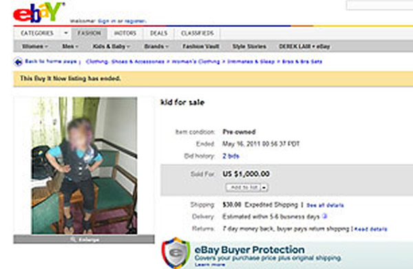 网民在eBay上拍卖从收藏品到房子的各种东西,但你听说过卖孩子的吗?7月,一名澳大利亚妇女便决定将自己的孩子在eBay上拍卖。她发布的广告中贴出了孩子的照片--一名男孩和一名女孩,年龄不到10岁。更令人感到不可思议的是,居然有陌生人出价竞拍。
