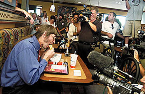 如果你看过摩根-斯普尔洛克执导的影片《超级汉堡王(Super Size Me)》,一定知道丹-格尔斯克,他非常喜欢麦当劳的巨无霸,每天几乎都会吃一个这种食品,格尔斯克表示,自1972年至今,他只有8天没吃巨无霸。今年早些时候,他吃下他的第2.5万个巨无霸,也就是说他在40多年间摄入1350万卡路里,也就是72.5万克脂肪和2600万毫克钠。也许麦当劳黄金拱门下的签字应该写成“提供22亿——大部分供给丹-格尔斯克”。