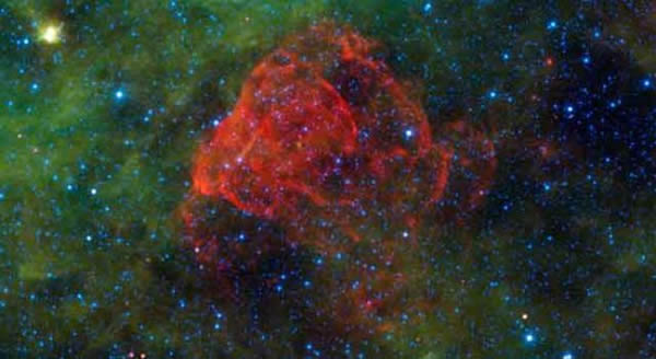 超新星爆发是宇宙中最强烈的爆炸事件,它是一颗大质量恒星抵达生命终点,耗尽其内部燃料之后发生引力塌缩的结果。爆炸产生的剧烈冲击波会加热围绕其四周的尘埃和气体物质,到自豪它们发光并在这张红外图像中显出红色。尽管在爆炸中原属于这颗恒星的大部分物质会被远远地抛入太空深处,但是令人难以置信的是仍然会有一部分物质留下来,形成一种密度极高的状态,称为中子星。在这一特定的案例中,船尾座A内部的中子星处于高速旋转状态之中,其自转速度达到惊人的每小时300万英里(约合482万公里)不过因为中子星很小很暗,在这张图像中我们是看不到它的。天文学家们对于它如此高速的自转感到困惑不解,并因此给它取了一个绰号“太空炮弹”。