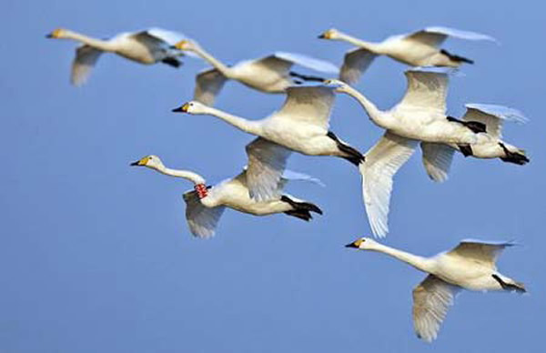 黄河三角洲自然保护区首发现蓝色环志大天鹅