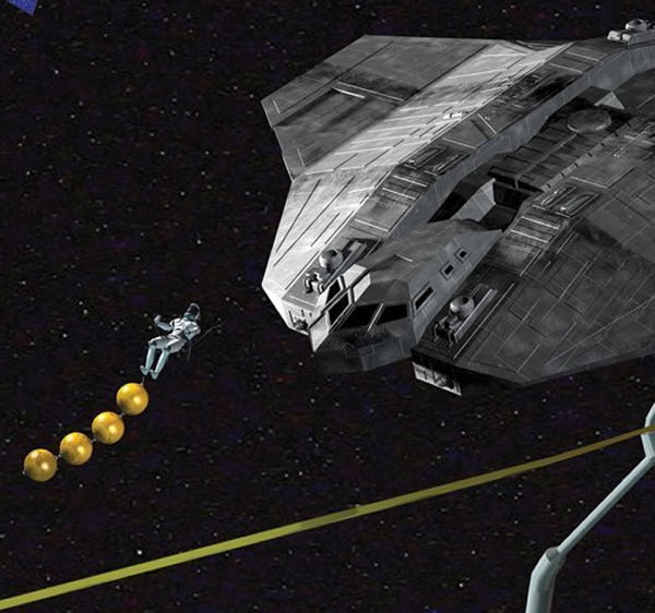 拯救地球:一个撞向地球的小行星能够被一个足够大的采矿宇宙飞船通过轻微的引力作用,把它推到一个安全的轨道上来。