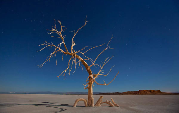 当地时间2011月1月20日,美国加州兰德附近,沙顿海南端的盐田里,满月光辉映照着一棵枯死的橡树。
