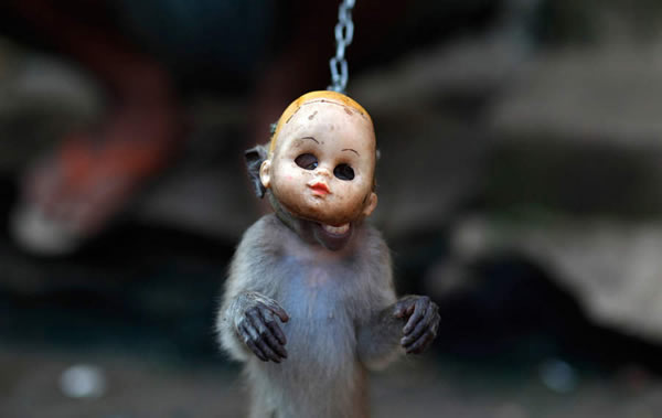 当地时间2011年4月25日,印尼雅加达,一只带着面具的猴子在街头表演猴面舞。训猴人Karmini称,他的四只猴子通过表演舞蹈,每天可以为他带来10美元的收入。