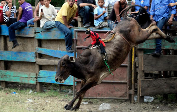 当地时间2011年1月16日,尼加拉瓜首都马那瓜北郊,当地的一个斗牛活动上,一只猴子骑在公牛背上表演。