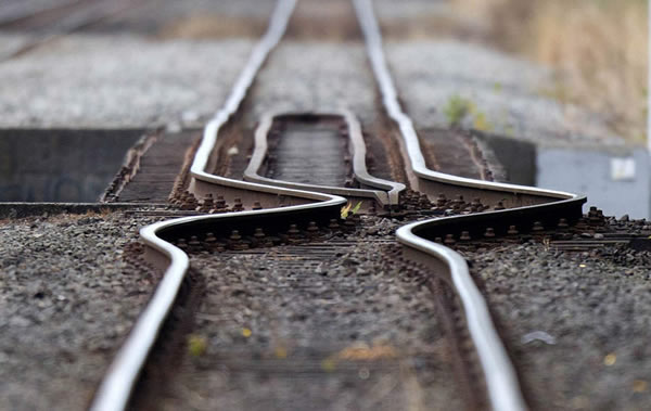 当地时间2011年2月23日,新西兰基督城,一段被地震扭曲的铁轨。2月22日,新西兰发生6.3级地震。