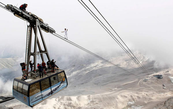 当地时间2011年8月20日,瑞士杂技表演者弗雷迪-诺克挑战德国南部最高峰楚格峰,在没有任何安全装备的保护下,他在山间的缆车钢丝绳上行走了约90分钟。
