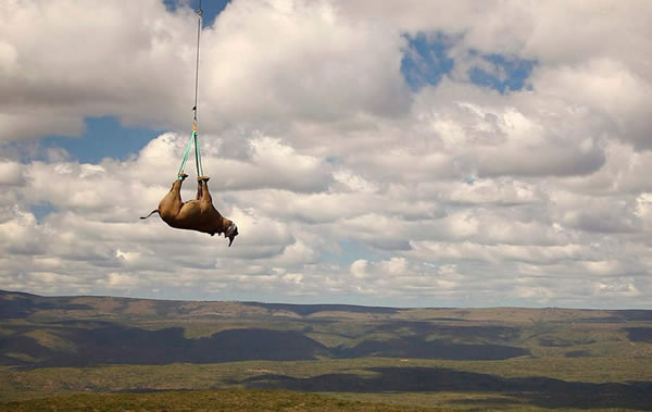 当地时间2011年11月8日,GreenRanaissance提供的一张图片显示,11月3日,南非军用直升机将被催眠的黑犀牛从南非偷猎严重的开普省东部山区运到15公里外林波波省的新家。这项活动由世界自然基金会组织。黑犀牛在南非某些公园和私人领地受到严重威胁……