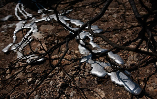 当地时间2011年4月26日,美国德克萨斯州,一处被烧毁的居民区前,金属在高热地表的炙烤下融化为液态。4月的德州山火至少烧毁了当地167户民居。