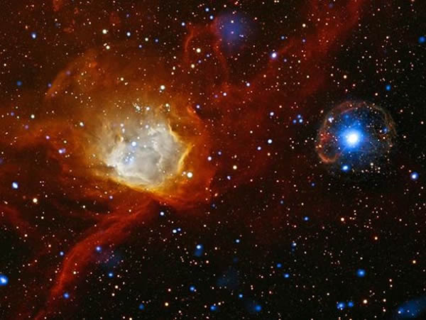 本图由美国宇航局“钱德拉”X射线天文望远镜和欧洲航天局XMM-Newton天文望远镜的X射线数据以及位于智利的托洛洛山美洲天文台的可见光数据组合而成。三部天文望远镜在太空中发现了一颗明亮的新星:一颗年轻的脉冲星正被超新星的残骸所包围。脉冲星是死亡前经过剧烈爆炸的恒星的旋转内核。X射线数据显示,这颗新发现的脉冲星呈现出一个亮蓝色的光点(见本图右上部)。可见光数据显示,这颗恒星残骸的周围包裹着一层尘埃和气体外壳。这也是在小麦哲伦星云中首次发现这样的天体,小麦哲伦星云是银河系的卫星星云。本图还显示了附近一个恒星形成区内错综复杂的结构。