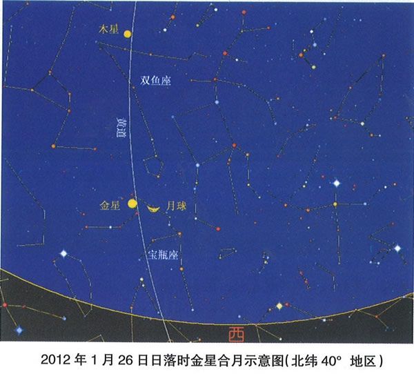 从2011年11月开始,行星中最明亮的金星就逐渐走入了我们的视野。这段时间,金星是作为昏星(长庚星)出现在太阳的东侧,黄昏时分我们可以在西南方的低空中看到它。以北纬40°地区为例,1月份日落时金星的地平高度会由23°增大至34°,亮度约-4等,观测条件非常理想。在太阳系中,金星是仅次于水星距离太阳第二近的行星,同时在大多数情况下它也是距离地球最近的行星。由于其表面覆盖着非常浓密的大气,对太阳光的返照率较高,距离又近,因此在地球上看上去金星非常明亮。