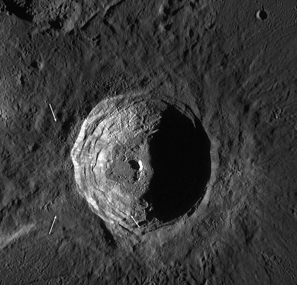 这个陨坑的边缘壁看上去颇似露天矿,存在着月球表面碰撞之前的矿石和陨坑形成末期进入该陨坑的月球表面岩石。该陨坑壁形成的矿层呈现扇形结构,是碰撞形成月球陨坑之前的矿物碎石,沿着陨坑壁存在着明亮和暗黑色物质。