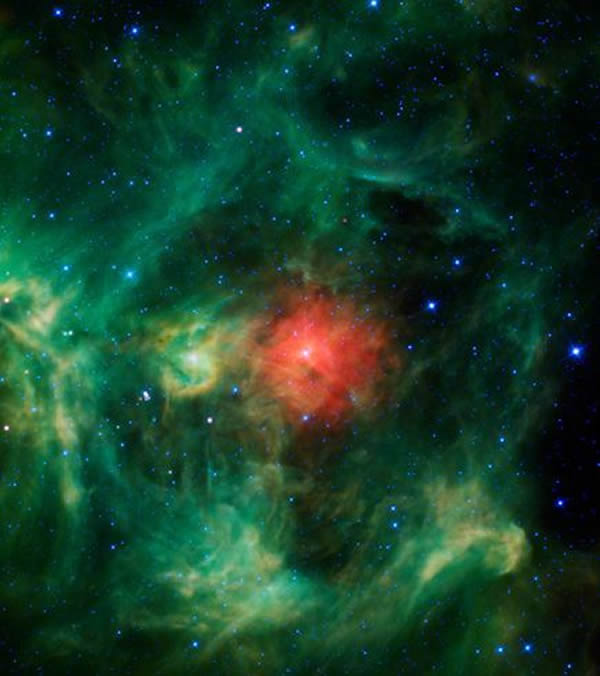 美国宇航局的广域红外探测器拍摄的新照片,展现了一个花环状星云,明亮的红色尘云被绿色星际物质环绕。这个星云的正式名称为“巴纳德3”,是一个恒星形成区,距地球大约1000光年。红色尘云内的一颗明亮恒星可能影响星云的形态,导致其放射出红外线。照片中散布的蓝点是位于星云前方或者后方的恒星。