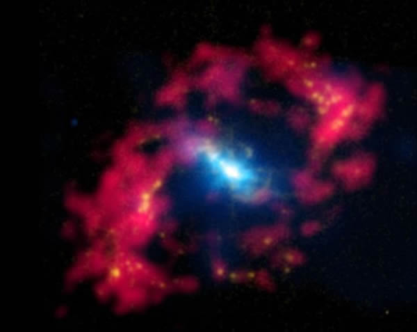 科学家们现在正努力搞清楚这一吞噬过程何以释放出如此剧烈的X射线(蓝色)辐射,并希望借此加深他们对于黑洞吞噬机制的理解。因此看起来这个宇宙之眼的形状似乎完全出自巧合。围绕这个黑洞的那些红色氢气体物质是由美国国家自然科学基金会(NSF)的甚大天线阵(VLA)获取的。除此之外,这张合成图像还综合了来自美国宇航局钱德拉塞卡X射线空间望远镜(X射线波段,蓝色)和帕尔马山1米口径的雅各布·卡普坦望远镜(可见光波段,黄色)的图像数据。图像中在红色带中的黄色团块是炽热的恒星新生区。