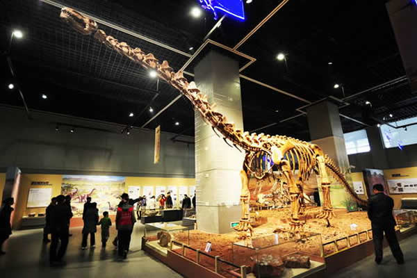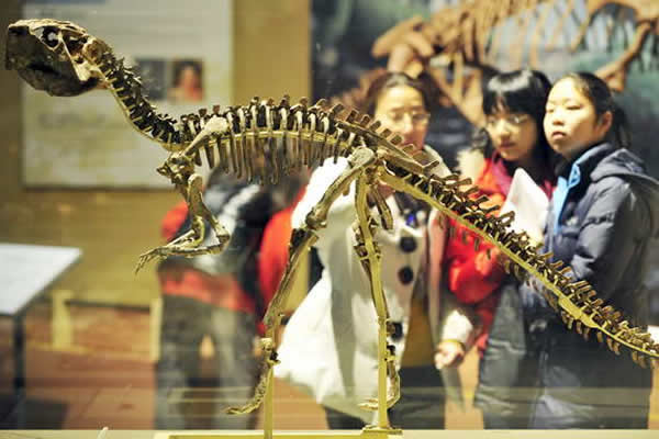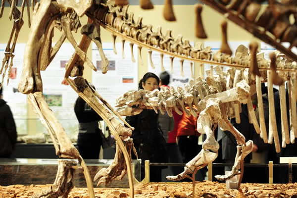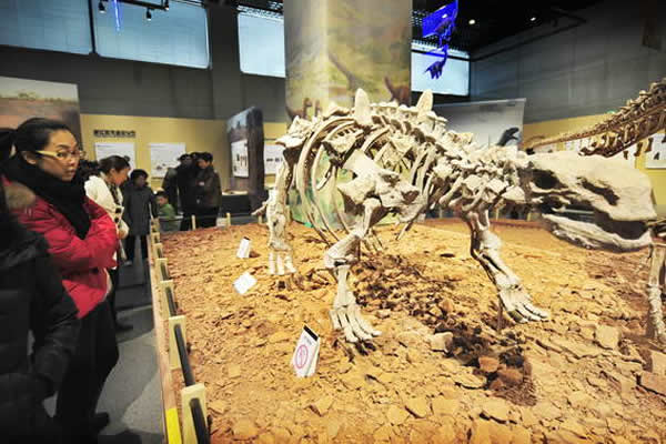 观众正在展厅里观赏一件恐龙骨架化石