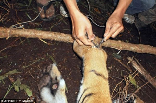 警方积极与环保局合作,侦破了一个可疑的偷猎团伙,过去12个月在这一地区发现很多类似陷阱。这个月早些时候截获4箱虎皮和虎骨,当时走私犯正想带着它们穿越边境。对走私犯来说,这个捕获物可能价值6万美元,他们打算在黑市上出售它。虽然警方怀疑这个金属陷阱是偷猎者设置的,但是它身上的箭伤可能是偶然在森林里发现它的受惊的当地人造成的。