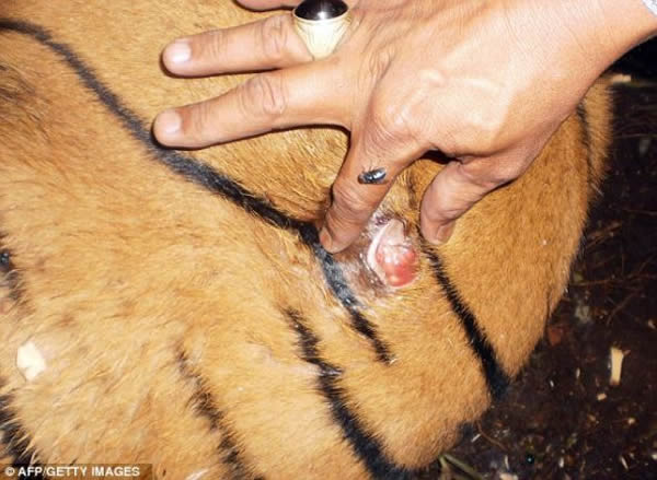 被受惊的当地人射伤:一名环保局工作人员展示了老虎身上的一处箭伤