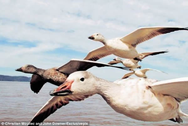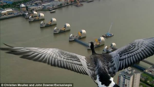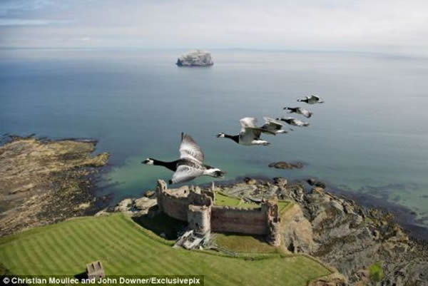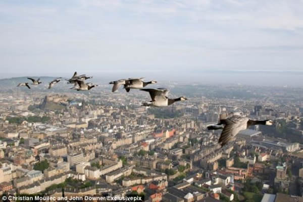 法国摄影师克里斯蒂安-穆莱克驾驶机动滑翔飞翼与一群黑雁比翼齐飞,同时用镜头记录下迁徙的黑雁飞越英国,朝着北极地区迁徙的精彩画面。当时,穆莱克的飞行高度达到1500英尺(约合457米),成为雁群的队长。在12日晚上8点英国广播公司第一台播放的具有突破性的鸟类纪录片《飞越地球》中,观众们可以欣赏到这些令人难以置信的照片。