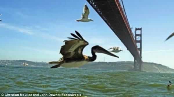 褐色鹈鹕在旧金山金门大桥下方飞过