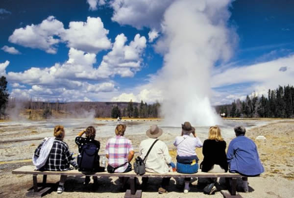 游客在观赏“老忠实”间歇泉