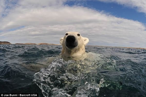 这些令人吃惊的野生北极熊的近照,是这些庞然大物从距离勇敢的法国摄影师乔-布尼只有几十英寸的地方游过时,他拍摄的。
