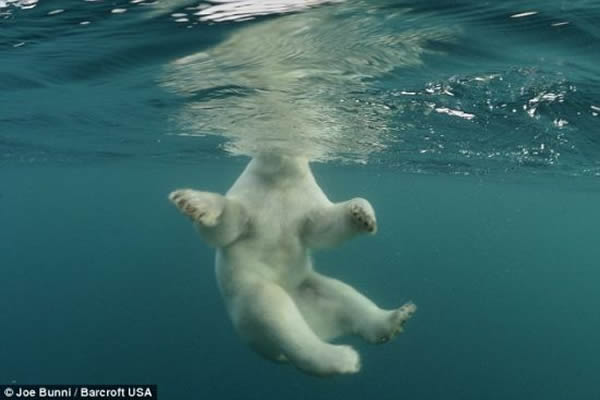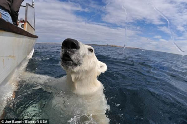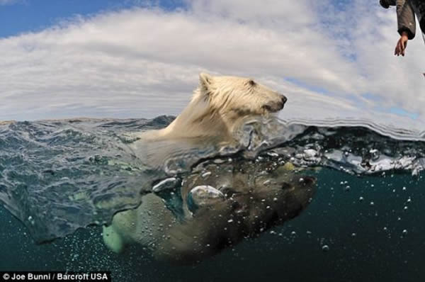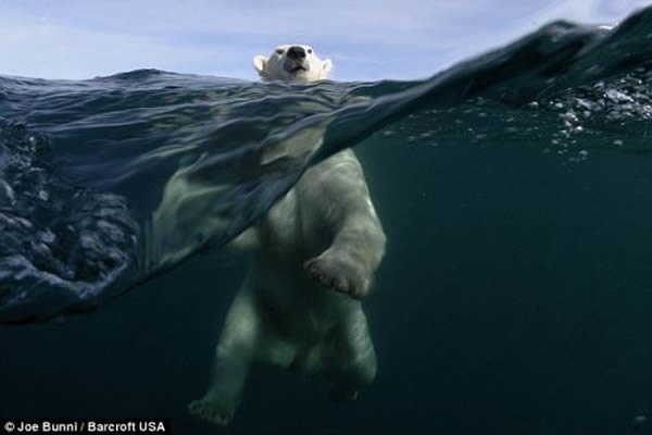 虽然很少有人愿意在北冰洋寒冷刺骨的海水里距离这些充满危险的北极熊不超过50英尺(15.24米),但是法国环保人士布尼确实这么做了,尽管他答应妻子不会这么做。仅穿着干式潜水服、戴着水下呼吸管和面罩的布尼潜入温度只有2摄氏度的加拿大努纳武特地区的海水里,靠近重达700磅(317.51公斤)的北极熊不足20英寸(0.51米)。有两次这种动物距离57岁的布尼非常近,它们的鼻子甚至碰到了防水相机的外壳。但是在一次遭遇中,他刚远离一头北极熊,这个庞然大物就发起怒来。