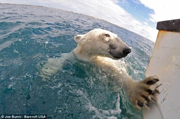 家住巴黎的布尼说:“一年前的一次令人吃惊的经历,让我打破了我自己的所有安全准则,变得对我与这些奇妙动物之间的关系过于自信。那次遭遇出人意料,那头北极熊变得焦灼不安,并开始咆哮,这让我的内心充满了恐惧。我没有尊重大自然,那头熊向我重重击来,它的有力爪子几乎撕碎了我们乘坐的船,在金属外壳上留下很多爪痕。我的船长几乎没时间把我从水里拖上来,我在海里拼命向前游,这种自然界最大的陆地食肉动物就在不远处紧追不舍。”