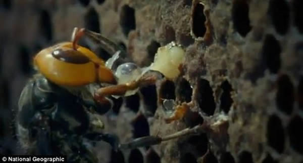 物竞天择:一只大黄蜂从蜂巢拖出一个幼虫,吃了它,然后将其变成一个粘糊糊的肉团,这就是它们后代的食物了。