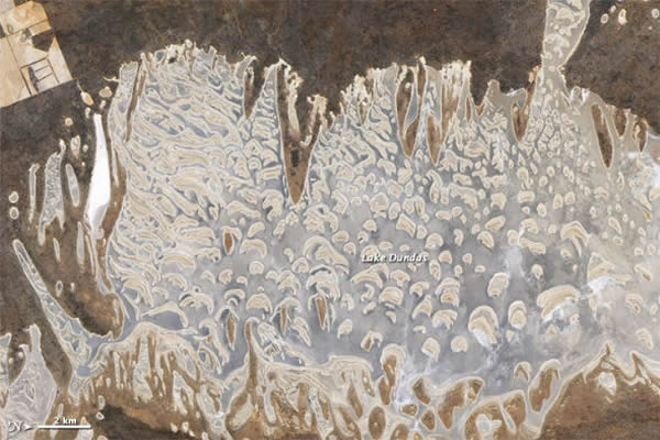 邓达斯湖的西南部(图像左上角)是农业区,可以通过其整齐、笔直的边界辨认出来。相反,湖的轮廓参差不齐,东部和西部有很长一段旱地戳入湖中。澳大利亚的许多地区气候干燥,雨量稀少,邓达斯湖又浅又咸,尤其是在夏季。