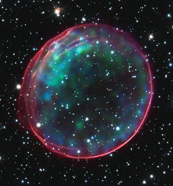 一幅可见光与X射线照片的合成图像,呈现了超新星产生的“气泡”,所用照片来自美国宇航局的两架望远镜。在这幅图像的帮助下,天文学家揭开了一个宇宙谜团,即何种因素导致了明亮的超新星。