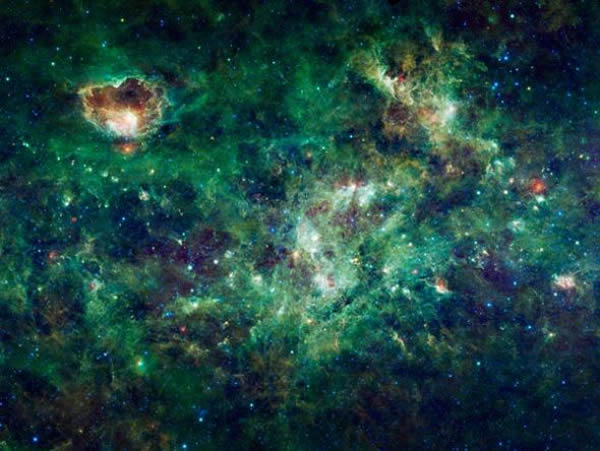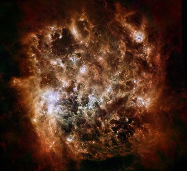 一幅新合成图像,展现了银河系的卫星星系——矮星系大麦哲伦星云。美国宇航局斯皮策太空望远镜获取的红外数据在图片中表现为蓝色区域,是大麦哲伦星云内温度最高的区域。高温来自于新形成的恒星,所产生的辐射加热周围的尘埃。在温度最低的区域,恒星形成活动刚刚开始或者已经结束。展现这些区域的数据来自于欧洲航天局的赫歇尔太空望远镜,在图像中表现为红色。
