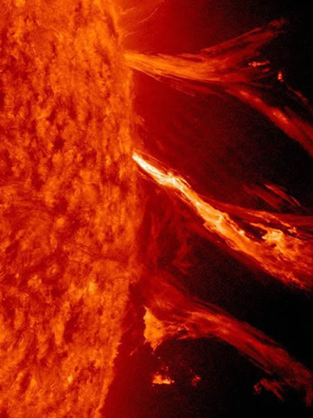 照片由美国宇航局太阳动力学观测卫星拍摄,展示了太阳远侧出现的耀斑。1月2日,日冕物质喷射导致的太阳粒子喷发形成巨弧。此次日冕物质喷射并没有对准地球,如果朝向地球,带电太阳粒子会破坏亮面的卫星通讯和电网。此外,太阳粒子还会与地球大气层中的分子发生相互作用,形成绚烂的极光。
