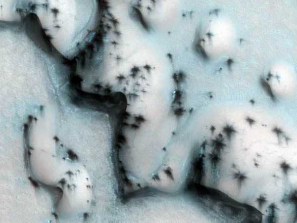 美国宇航局火星侦察轨道器新拍摄的一幅照片,展示了火星北极地区的明亮沙丘,星状暗斑好似胡椒粉一样洒在上面。这些新月形沙丘之所以如此明亮的原因在于:它们包裹着一层二氧化碳霜。随着火星北半球告别冬季,这种霜开始升华,直接从固态变成气态。沙丘上的暗斑是霜消失的结果,暴露出下面的玄武砂。