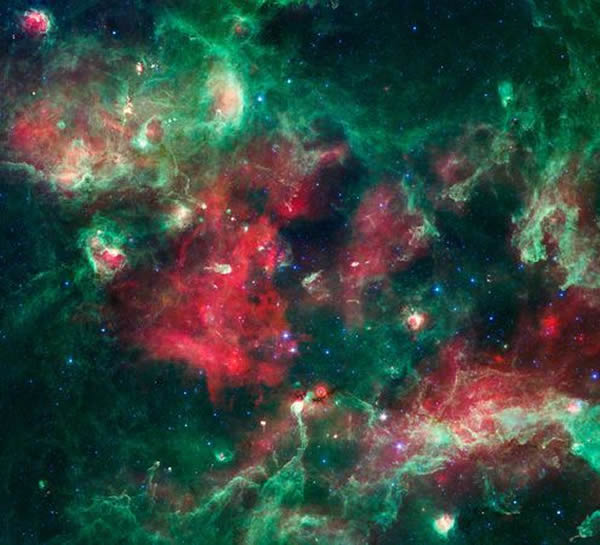 这幅新拍摄的红外照片允许天文学家一瞥天鹅座X内的恒星形成区。天鹅座X是银河系内最活跃的恒星托儿所之一。这个热闹非凡的气体与尘埃区位于天鹅座,距地球4500光年。尘埃通常阻挡可见光,但红外线可以穿透尘埃,允许美国宇航局的斯皮策太空望远镜拍下这幅新照片。这幅照片揭示出其他方式无法观测到的天体和结构。例如,我们可以在照片中看到还处于胚胎状态的恒星以及由大质量恒星辐射雕琢的密集尘埃柱。