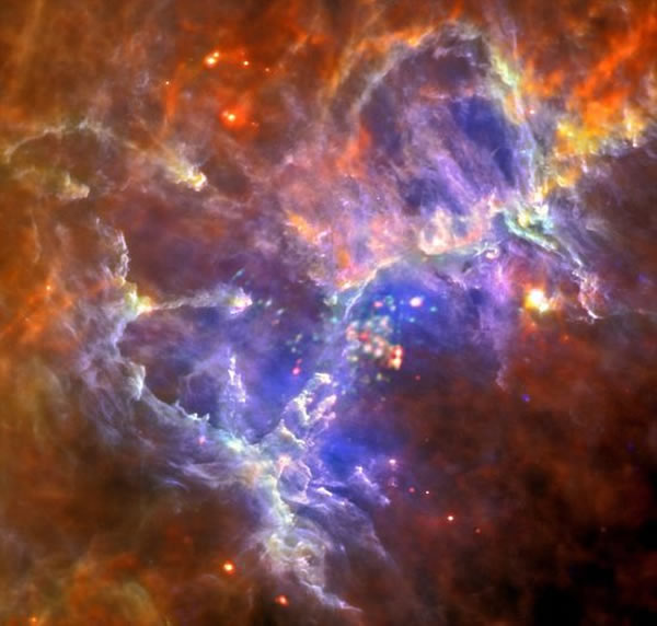 结合可见光和X射线的末端电磁波谱,可呈现从可见光至X射线的完整放射线光谱,欧洲宇航局的赫歇尔太空望远镜和牛顿太空望远镜拍摄到炽热年轻恒星“刻画”环绕其周围的太空物质。