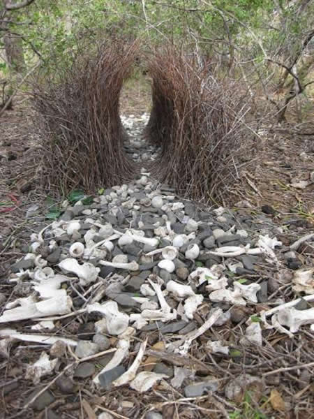 研究人员报告说,雄性造园鸟用制造某种错觉的方式来装饰它们的求偶之处以得到其配偶。 为了追求雌性,雄性的大造园鸟会集结一套骨头、贝壳、石头及其它灰色物体,这些物体统称“石膏”。 该雄鸟会在由致密的茅草枝条搭建成的两堵墙和一个底层组成的某一路径之前花多个小时的时间费力地排布这些石膏。 当雌鸟站在这条路上的时候,雄鸟会拾起诸如一个水果等色彩鲜艳的物体,并它们其逐一展现给雌鸟看。 雄鸟会将较大的石膏物体摆放在距离该路径入口较远的地方,并将较小的物体摆放在距离入口较近的地方。 由于物体通常会随着距离增加而显得较小,因此这种排布石膏体的方式制造了一种错觉,即这些物体大体上都有着同样的大小,而石膏面积比实际上要小一些。 这种错觉被称作“强制透视”。