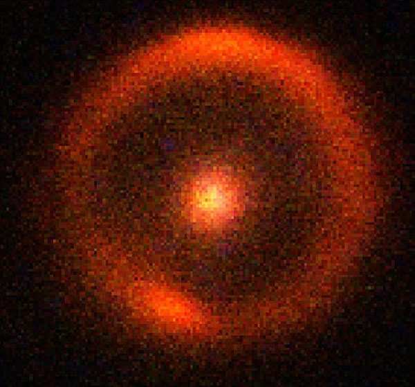 这是一张由夏威夷凯克望远镜利用星系引力透镜效应获取的图像,科学家们认为这个遥远的星系主要由神秘的暗物质组成