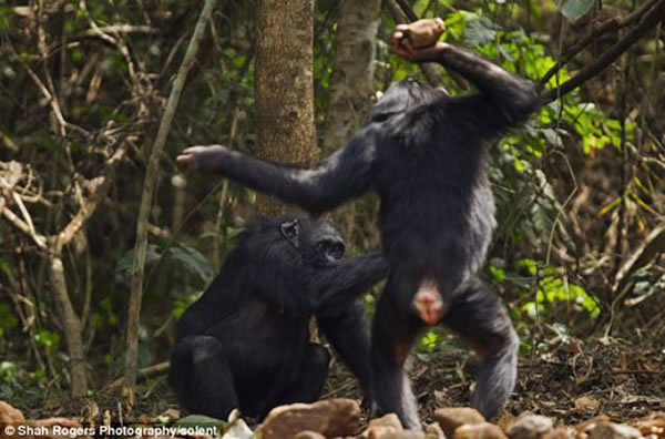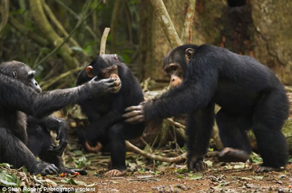 英国摄影师近日拍摄到惊人的一幕:小黑猩猩向其它黑猩猩投掷石块,遭到猩猩母亲的掴脸,旁边稍年长的小猩猩兄弟前来劝阻。由此可见,黑猩猩具有“人类的一面”。