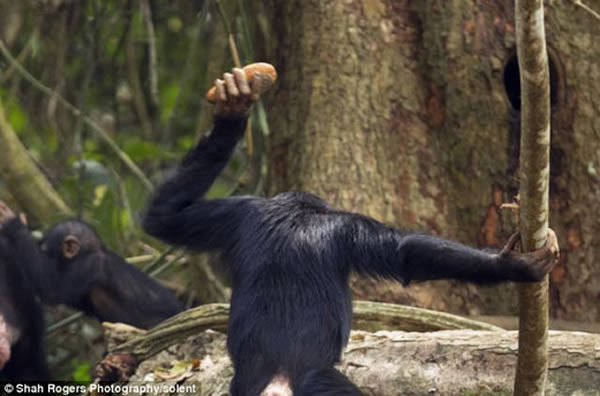 小猩猩乔亚把石块举过头顶,向其它猩猩投去