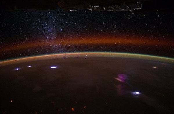 宇航员拍到非洲上空的风暴,并出现白色光点的闪电,远处是朦胧带状结构的银河系