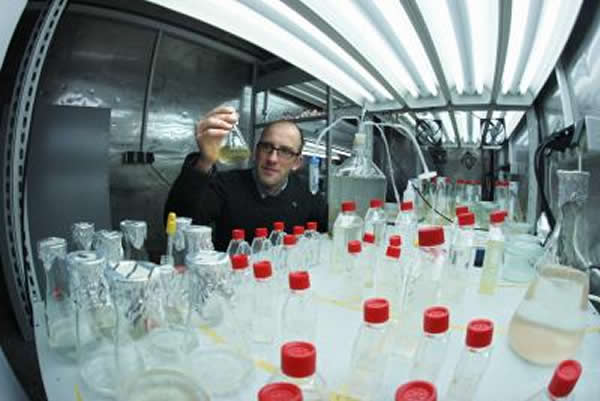 弗里德里希•席勒-耶拿大学化学家Dr. Georg Pohnert检查保存于特殊容器中的海藻。