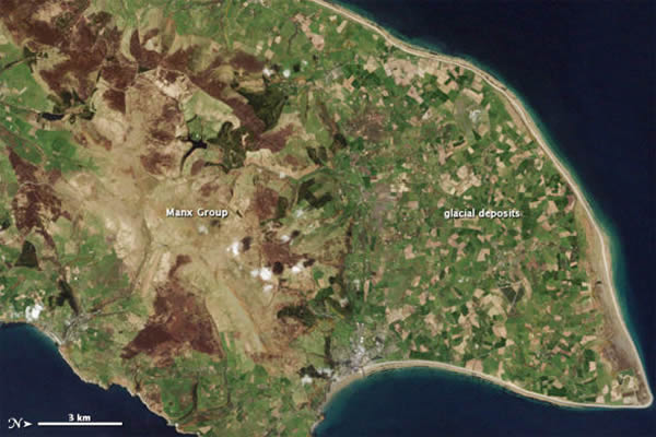 这张自然色照片由美国陆地卫星7号(Landsat 7)于2001年5月1日拍摄,展示了马恩岛北端的图景。马恩岛北部是相对平坦的沿海平原,被农田覆盖,形成了一个粗略的三角。
